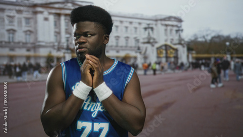 man, hand, clasped, building, african, american, young, outdoors, jersey, basketball, contemplation, introspection, thought, pondering, meditation, sharpened, concentration, seriousness, calm, wristband, beard, afro, activewear, sport, number, standing, urban, street, crowd, palace, gate, holiday maker, public, piazza, fitness, training, player, athlete, male, finger, prayer, blue, black, gesture, expression, gaze, upward, wrist