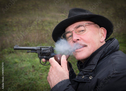 weapon, gun, lock, police, steel, violence, power, handgun, arm, military, gang, macro, bullet, band, stainless, sight, criminal, eye, hand, russia, armed, holster, old, force, army, officer, pipe, smoking, male, man, 1, elegance, facial, bowler, white, nostalgia, clothing, character, hat, view, hero, imagery, boater, traditional, person