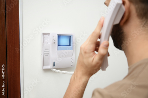 Man with handset answering intercom call indoors