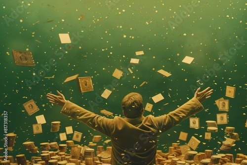 Man With Outstretched Arms in Front of Pile of Cards. Generative AI
