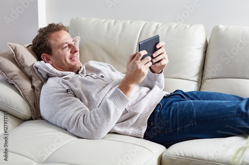 smartphone, electronic mail, text message, texting, reading, checking, electronic mail, smart, phone, cellular, phone, mobile, mobile phone, technology, electronic, cyberspace, online, web, social, media, call, talk, touch, screen, friends, message, chat, communication, electronic, mail, man, male, guy, people, person, adult, photogenic, casual attire, caucasian, lifestyle, background, young, fashion, house, interior, apartment, room, living room, sofa, lying