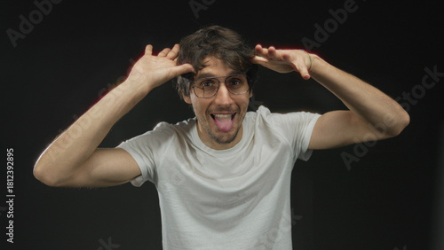 Man with tongue out and raised hands gesture wearing white shirt and glasses in black studio; playfulness.
