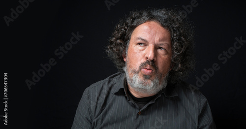 prevention, observe, alertness, analysing, perception, uncertainty, conservative, alarm, thinking, politic, arm, clothing, copy space, model, eye, photogenic, studio, moustache, smile, adult, style, natural, head, smart, age, attitude, real, art, human, dramatic, curly, dark, black, background, beard, isolated, long hair, man, male, looking, long-haired, lifestyle, expression, attractive, bearded, appearance