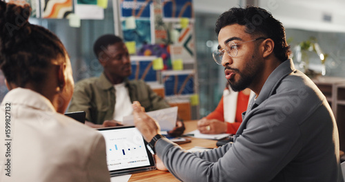Man, woman and graphic designer with tablet at office, review charts or project management at startup. People, tech and team with graphs, talk or application ux for problem solving at digital agency