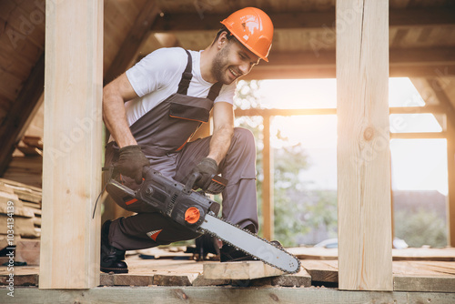 Man worker in work uniform and gloves working with chainsaw of woodcutter sawing chain saw in motion, sawdust fly to sides. Concept construction of wooden houses.