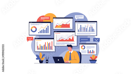 Man working on a laptop, surrounded by multiple screens displaying financial charts and data, illustrating data analysis, financial reporting, and business intelligence.