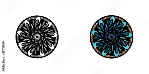 mandala ornament for coloring - outline and colored side by side