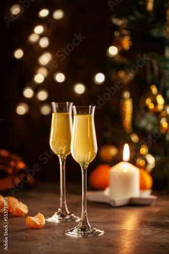 Mandarin liqueur for Christmas. Festive concept. Mimosa cocktail