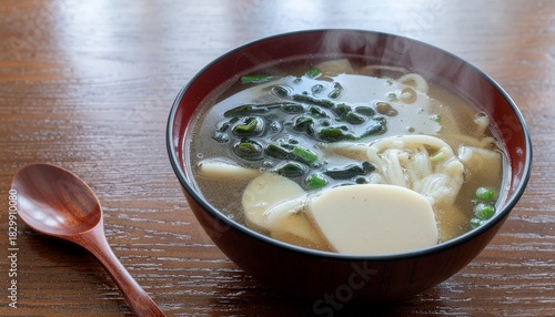 soup, japanese, cookery, bowl, food, miso, broth, oriental, traditional, asian, culture, meal, dinner, lunch, epicure, healthy, nourishment, delicious, tasty, fresh, cooking, culinary, wooden, table, seaweed, tofu, noodle, mushroom, scallion, savoury, hot, steam, eat, dining, eatery, diet, ingredient, closeup, vegetarian, vegan, nourishment, comfort, wellness, vitality, simplicity