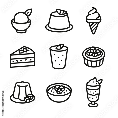mango, dessert, icon, outline, icon, set, dessert, sorbet, pudding, ice, cream, cake, slice, mousse, tart, jelly, smoothie, bowl, parfait, line, only, black, colours, consistent, stroke, weight