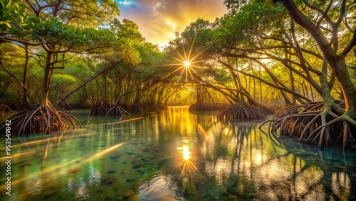 Mangrove Forest Floor**: Emphasize the vibrant, emerald hues of the mangrove forest floor, illuminated by warm, golden light, highlighting the natural beauty of the mangrove ecosystem.