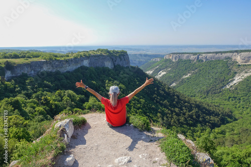 Mangup-Kale cave city, sunny day. A girl on the background of a mountain view from the ancient cave city of Mangup-Kale in the Republic of Crimea, Russia. Bakhchisarai.
