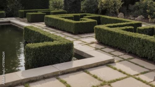 garden, hedge, duck pond, stone, pathway, geometric, tranquil, manicured, green, rectangular, pattern, outdoors, nature, landscaping, water, reflect, symmetry, design, serene, calm, formal, neat, lush, foliage, detail, texture, block, clean, edge, structure, shade, sunlight, botanical, growing, level, surface, border, shape, square, corner, angle, view, depth, distance, ground, perspective, horizontal, day