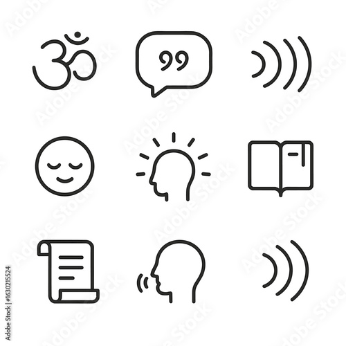 mantra, icon, set, outline, mantra, symbol, quote, bubble, echo, line, peaceful, face, speech, ray, journal, affirmation, scroll, soft, voice, chant, wave, line, icon, only, black, colours