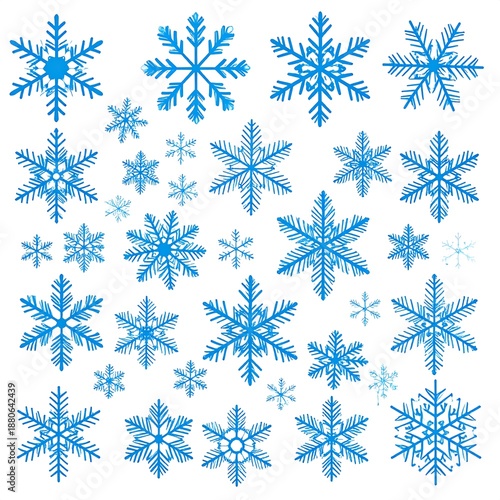 Many blue snowflakes of varying sizes and shapes arranged on a white background, creating a wintery pattern