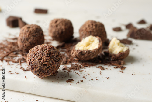 Many delicious chocolate truffles on white board, closeup. Space for text