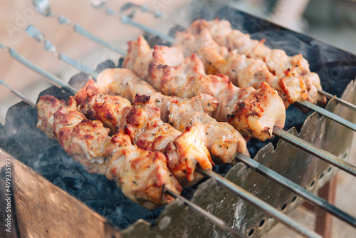 Many tasty appetizing shashlyk barbecute meat pieces on a grill.