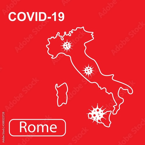 Map of Rome labeled "Epidemic and Quarantine COVID-19." White outline map of Rome on a red background. Vector illustration of a virus, coronavirus, epidemiology.
