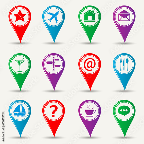 vector, star, aerodrome, home, envelope, letter, martini, glasses, pointer, cyberspace, food, eatery, yacht, question, tea, hot drink, cafes, bar, speech bubble, map, pin, location, icon, set, marker, icon, flat, travel, business, signs, symbol, element, global positioning system, technology, illustration, web, colourful, circle, graphic, abstract, place, buttons, shadow, communication, information, plane