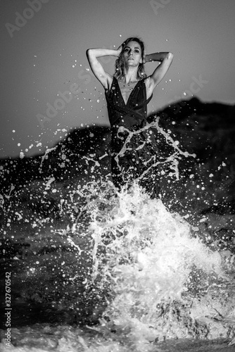 water, sea, woman, beach, wave, splash, summer, surf, fun, beauty, blue, people, damp, lovely, rock, person, bikini, nature, pier, sport, vacation, heaven, girl