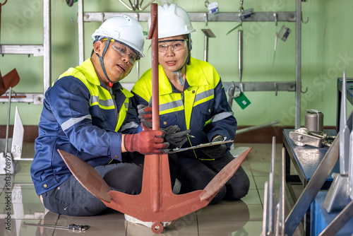 anchor, inspection, quality control, teamwork, factory, check, collaboration, marin, clipboard, helmet, metal, prototype, quality, equipment, floor, heavy, safety, gear, industrial, industry, engineering, examining, component, 2, man, male, woman, female, to sit, look, team, ship, testing, communication, control, inspecting, setting, collaborative, training, session, working, technician, men at work, serious