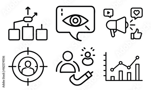 Marketing and Business Line Icons 6 Vector Icons for SEO Link Building, Sales Funnel, Promotion, Analytics, Customer Targeting and Digital Advertising