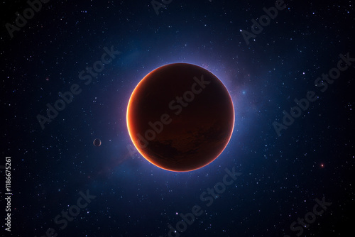 Mars appears vivid with its iconic reddish hue alongside one of its moons in the backdrop of deep space.