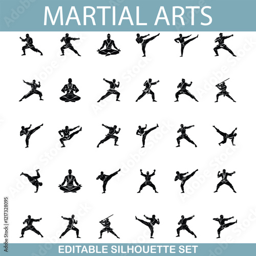 martial, art, silhouette, set, editable, pose, meditation, fighting, combat, self protection, karate, taekwondo, kung fu, judo, aikido, ninja, warrior, athlete, sport, activity, discipline, training, fitness, health, power, strength, agility, flexibility, balance, sharpened, concentration, graphic, design, illustration, vector, icon, symbol, artwork, black, white, man, figure, movement, action, style