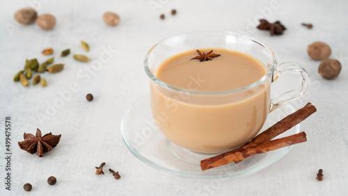 Masala tea chai in a glass cup with ingredients for cooking. Cinnamon sticks, ginger, cardamom, anise, honey, cloves. Traditional Indian drink - spicy black tea with spices and milk. Close up.