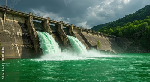 power, barrier, stormy, massive, industrial, environment, green, liquid, nature, dam, outdoors, churning, construction, spillway, mechanism, hill, spray, flow, cloud, mist, downstream, control, energy, blue, hydroelectric, wall, high-coloured, water, engineering, turbulence, flood, infrastructure, forest, sky, mountain, tree, vegetation, structure, generation, release, reservoir, upstream, concrete, torrent, electricity, natural, landscape, powerful