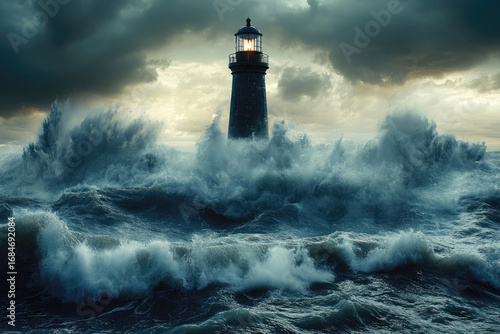 atmospheric, crashing waves, dark clouds, dramatic sky, lighthouse, mist, photorealistic, wave, sea, sky, light, ocean, beacon, storm, landscape, coast, water, sunset, cloud, tower, cloud, blue, beach, white, night, building, navigation, house, nature, safety, island, old