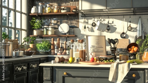 Master Chef's Culinary Haven Gourmet Kitchen with Professional Cookware Fresh Ingredients and Recipe Book Stand Perfect for Business Cards and Culinary Creativity