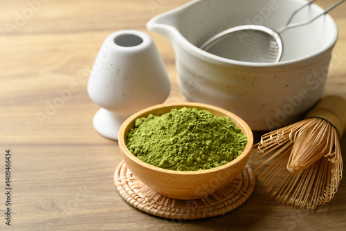 Matcha green tea powder with tea bowl and chasen on wooden background