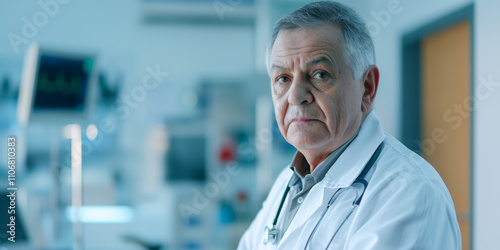 Mature Caucasian male doctor in a hospital setting with a serious expression