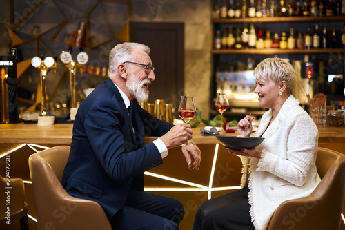 Mature couple of caucasian man and woman sit in restaurant and eat dessert, drink glass of wine. Male in tuxedo, female in white blazer. Woman holding dish
