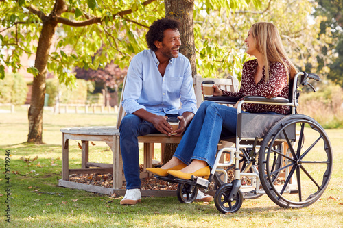 Mature Couple With Woman Sitting In Wheelchair Talking And Drinking Coffee In Park Together