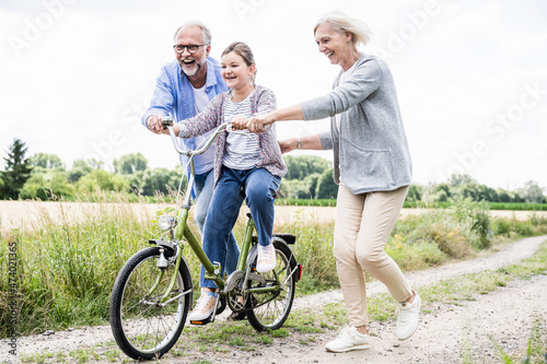 man, woman, helping, girl, riding, bicycle, dirt, road, three, fun, family, playing, learning, couple, people, adult, children, group, german, outdoors, elementary, retirement, casual attire, grandparent, bike, motion, leisure, practicing, mature, generation, playfulness, assistance, support, granddaughter, grandchild, grandfather, grandmother, running, togetherness, caucasian, bonding, lifestyle, enjoyment, clear, sky, cycling, female, male