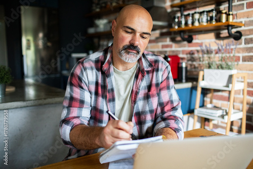 focused, budgeting, paperwork, personal finance, home office, laptop, kitchen, kitchen table, writing, note, pen, notebook, document, accounting, finance, freelancer, self employed, entrepreneur, small business, serious, thoughtful, concentration, bearded, bald, casual attire, sitting, indoor, home, brick wall, shelf, coffee machine, domestic life, business, finance, technology, people, lifestyle, copy space