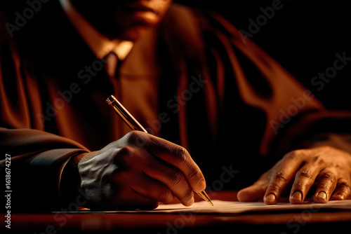 man, mature, judge, writing, pen, robe, gavel, law, justice, courtroom, desk, hand, serious, legal, decision, commitment, sharpened, determination, concentration, authority, leadership, wisdom, cognition, responsibility, honour, tradition, verdict, judiciary, solemn, posture, thoughtful, integrity, regulation, governance, judgement, suit, dignity, respect, experienced, judicial