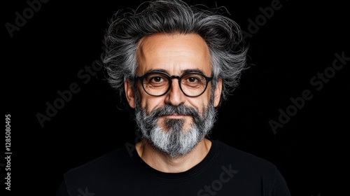 Mature Man with Stylish Hair and Glasses Posing Against Black Background