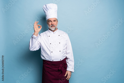 Mature professional happy man chef showing tasty ok sign isolated on light blue background.