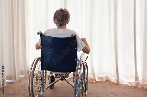 Mature woman in her wheelchair with her back to the camera at ho