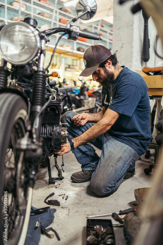 occupation, mechanic, motorbike, tool, working, repairing, job, repair, craft, workshop, indoor, exam, kneeling, casual attire, garage mechanic, checking, accuracy, skill, workwear, accessory, expertise, professional, scrutiny, baseball cap, one person, caucasian, full beard, spain, industry, transportation, kfz, device, cap, people, adult, man, beard, photo, color image