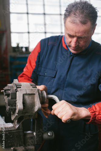 alternator, auto, automobile, car, caucasian, change, concentrated, engine, fix, fixing, garage, indoor, job, maintenance, male, man, mechanic, mechanical, man, occupation, 1, people, person, portrait, repair, service, shop, tool, transport, transportation, uniform, vehicle, work, men at work, wrench, work tool, garage mechanic, auto mechanic, white, adult, adult, 50s, grown-up, middle-aged