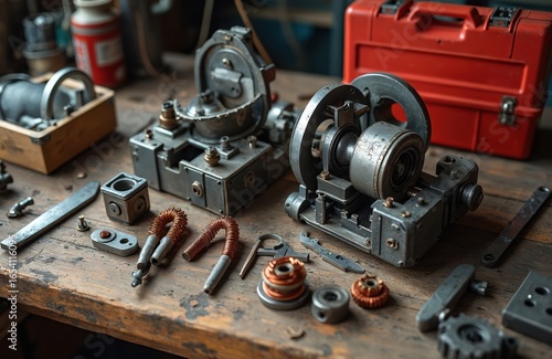 Mechanical parts, tools arranged on worn wooden table in repair shop. Focus on intricate machinery components, copper wiring, metal tools like wrench, screwdriver. Red toolbox sits in background,