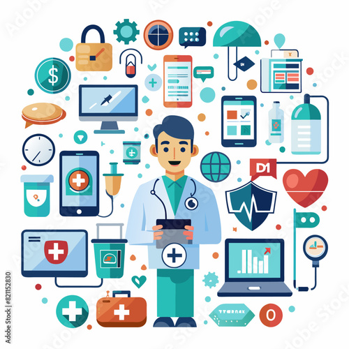 Medical and healthcare icons including doctor, syringe, and computer. Flat illustration on a white background. Healthcare and medicine concept. Design for posters, banners, print.