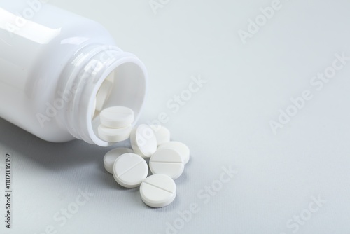 Medical bottle with antibiotic pills on grey background, closeup. Space for text