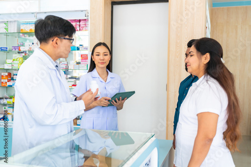 Medical pharmacy and healthcare providers concept. Professional Asian man and woman pharmacist recommend and selling medical product, medicine, drugs and supplements to patient customer in drugstore.