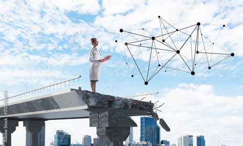 woman, brainstorming, bright, business, concept, confidence, professional, suit, work, confident, doctor, white, coat, medicals, health care, 1, background, medicine, health, care, clinic, uniform, people, adult, healthy, clinical, view, female, modern, holding, sky, cloud, skyscape, city landscape, city, urban, standing, outdoors, outside, broken, bridge, interrupted, network, structure, media, social, technology