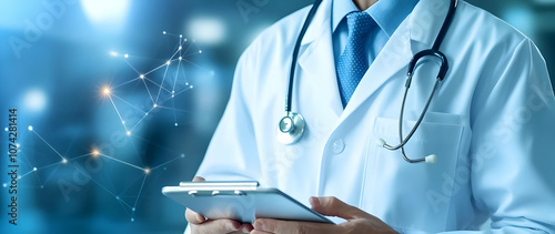 Medical professional holding a digital tablet in a modern healthcare environment, with data visualization elements.